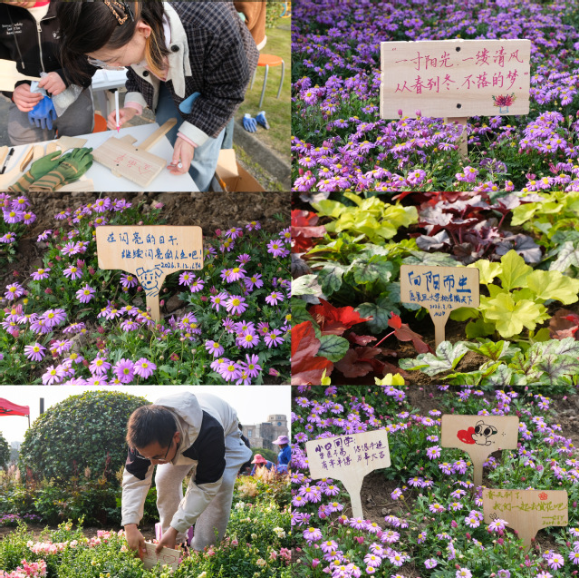完成种植后,师生向养护人员了解不同植物的日常养护知识,随后拿起彩笔,共同绘制植物标识牌。活动现场还准备了心愿卡片,供大家留下专属祝福与期许。真挚的话语掩映在花叶间,青春的面庞被光影定格,整片花境承载了师生最美好的情谊。